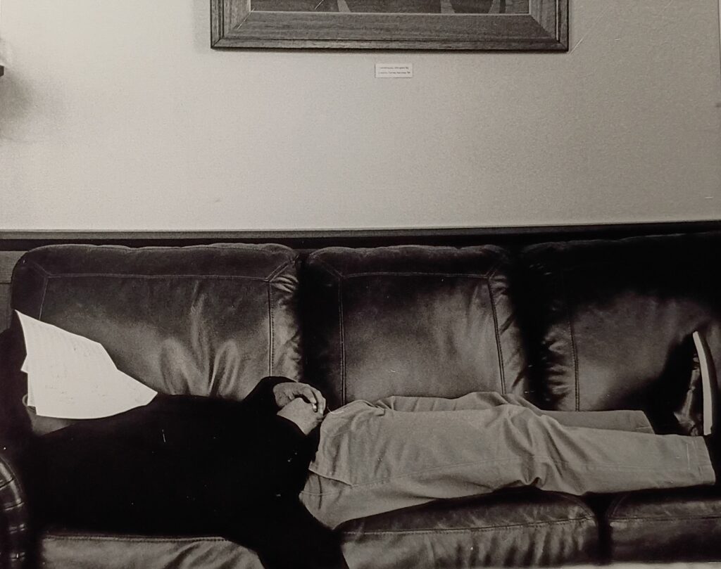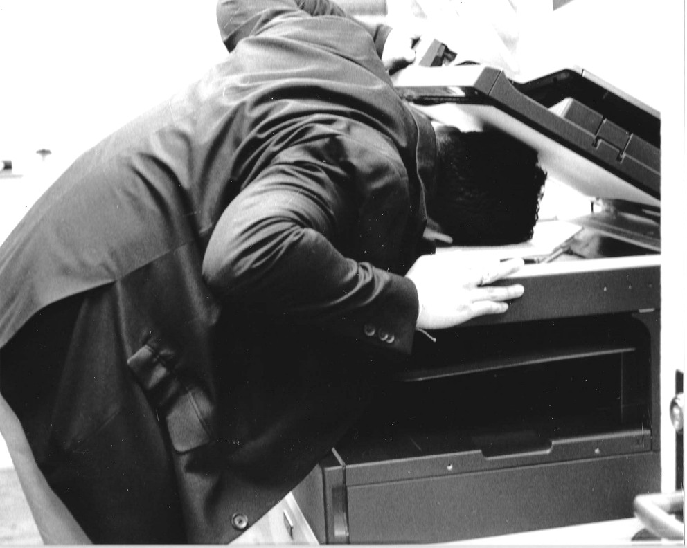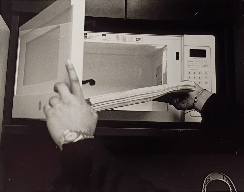 Breakroom breakdown is a four-part photo series done in 2024 that was meant to capture the phycological unraveling of an office worker trapped in monotony and overwork. Through a subtle shift in postures and expressions, the series portrays the arc from different stages of fatigue and disassociation. The first picture, Head Smash, conveys the feeling of phycological drain and not knowing what to do with your thoughts. He tries to squeeze his head in the printer’s scanner compartment. In the second picture, Breakfast, Lunch, and Dinner, due to the repetitive data he tries to burn the data papers in the microwave at work. Data, Data, Data, showcases him going a tad crazy as he is using a pen to circle things and underline things even though the whole page has the same thing over and over – Data. Lastly, Unwind, gives to me an eerie sense. It is the worker having a moment of ease for just a second and could be interpreted as a funeral almost. He is laying down as if he were in a casket.